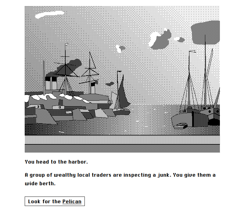 Interactive fiction about hiding in a 19th century harbor town, waiting for a ship to arrive. It's more of an existential mood piece than a game you can progress in or win.